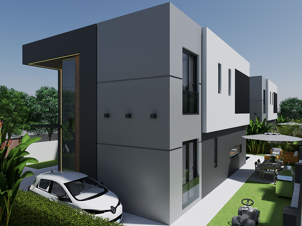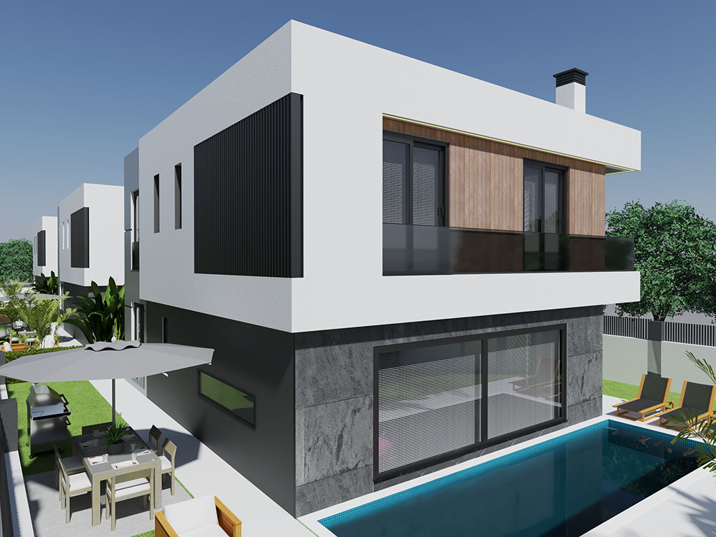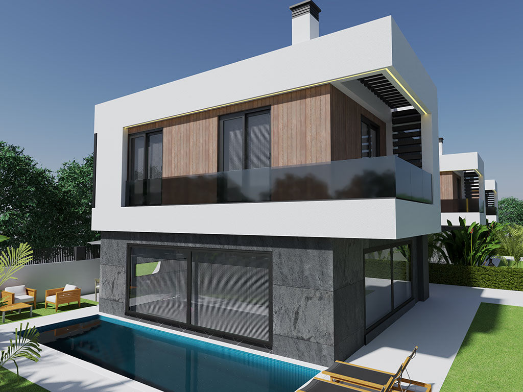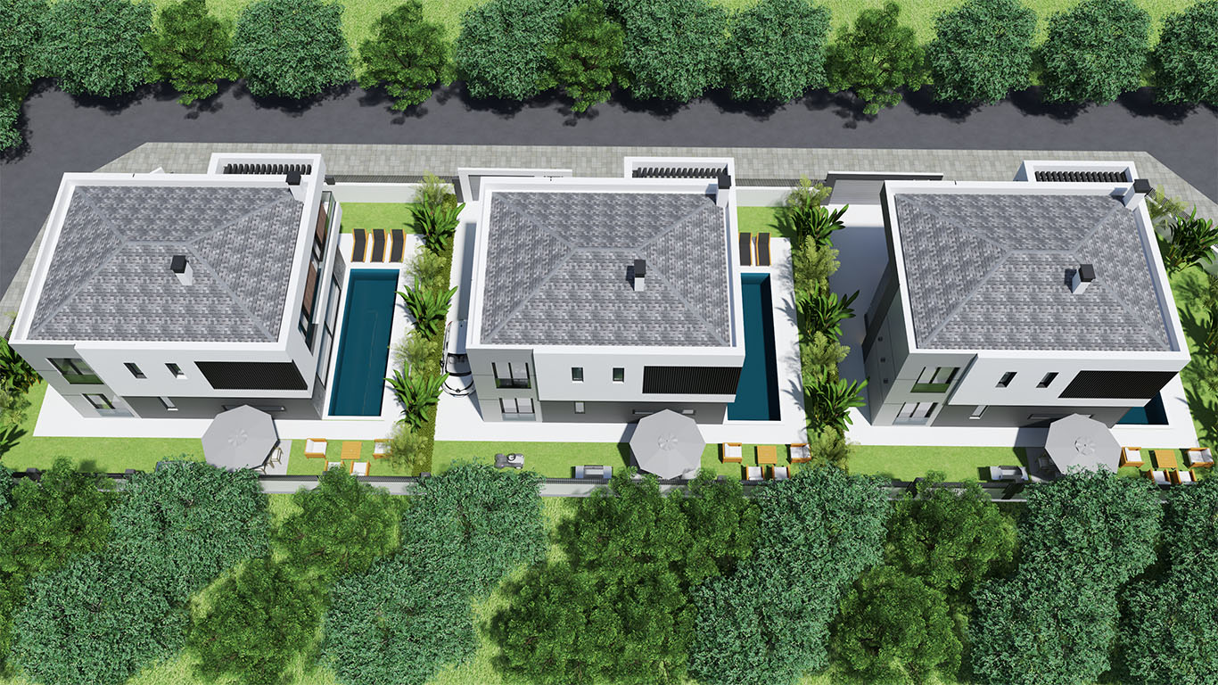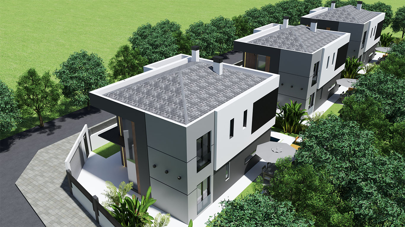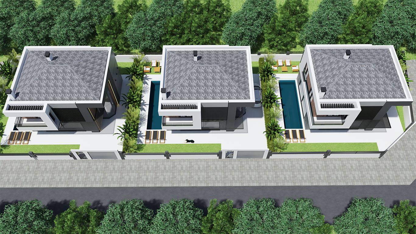 Modern Villas consist of 4 bedrooms, living room, kitchen, toilet, ensuite bathroom , dressing room, bathroom, 2 halls, front balconies, garden terrace .Villas have gross 245 m2 ,net 197 m2 indoors living space.Villas have indivicual swimming pool and parking space.