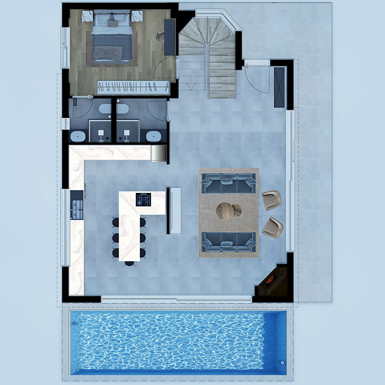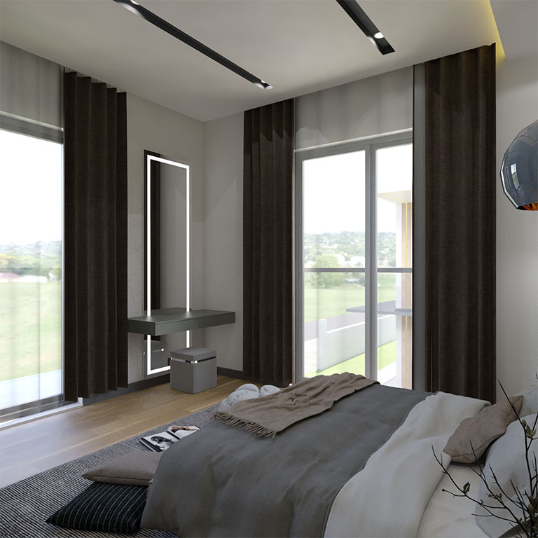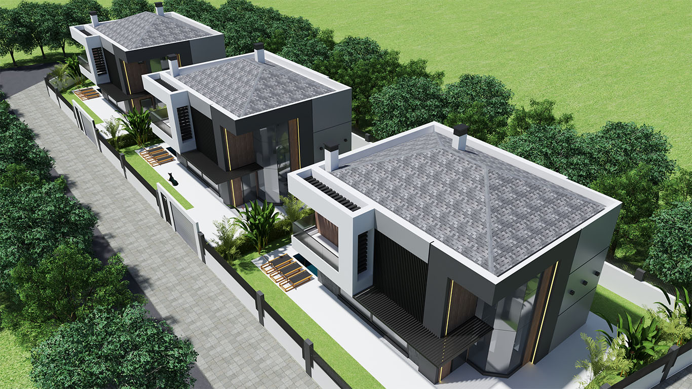 Modern Villalar 4 oda, salon, mutfak, wc, ebebeyn banyo, giyinme odası, ortak banyo, hol , ön balkondan ve bahçe terasından oluşmaktadır.Brüt 245 m2 net 197 m2 kullanım alanı vardır.Her villanın 339 m2 arsası müstakil havuz ve otoparkı vardır.